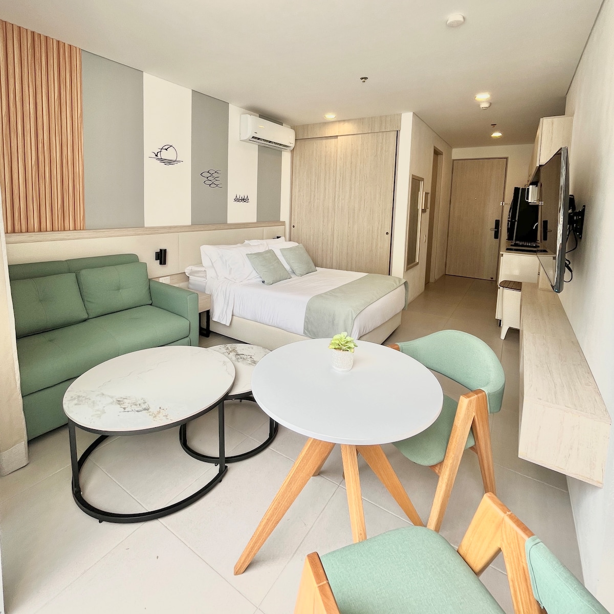 Departamento a 5 minutos del Aeropuerto Internacional Simón Bolívar, en edificio nuevo con dos ascensores, amplia zona de recepción. Hace parte del Condominio Resort COSTAZUL a donde queda el GHL Relax Hotel Costa Azul. Acceso directo al mar. Los huéspedes pueden hacer uso de todas las instalaciones del Resort, tales como piscinas, yacusis, restaurante, parque infantil, Gimnasio, sauna , entre otros .