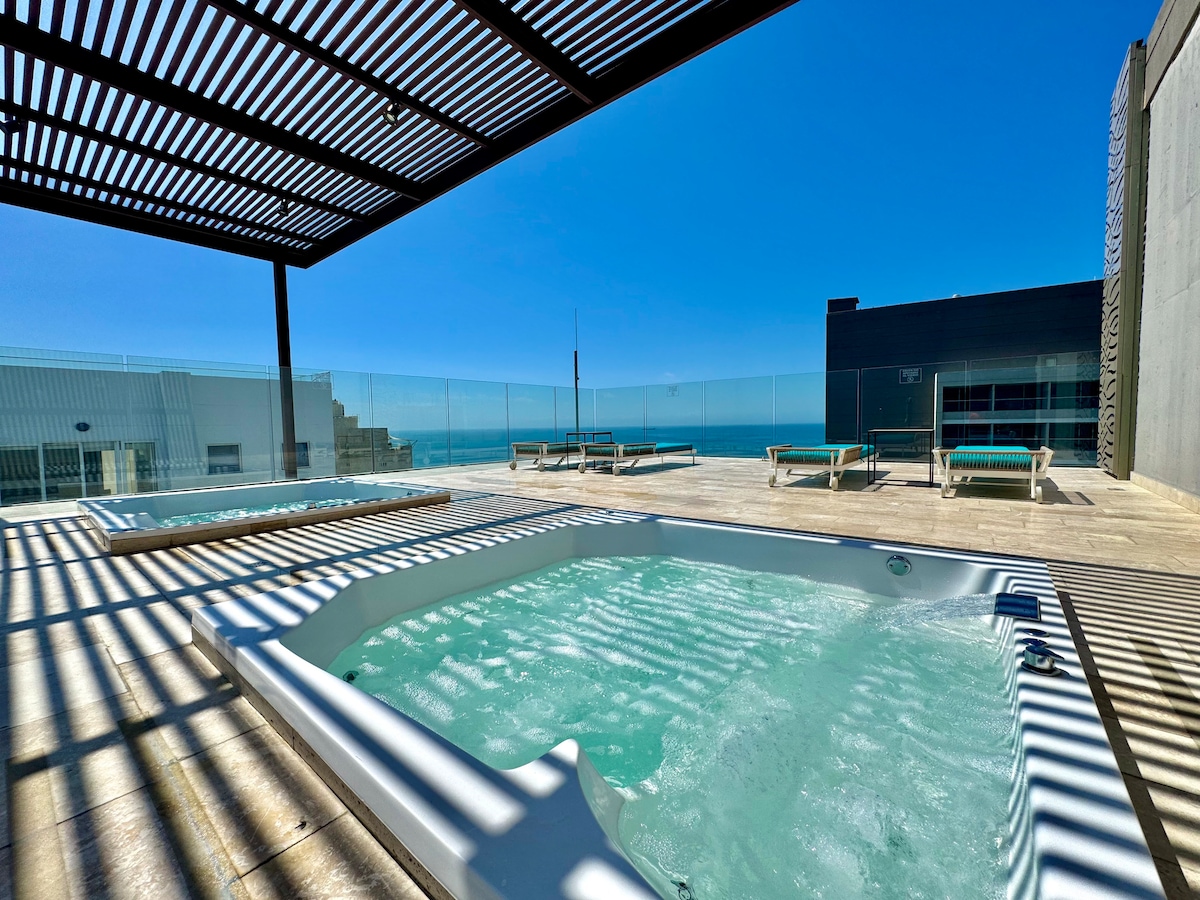 HOSTY HOME: Tu hogar fuera de casa. Apartamento con jacuzzi en la terraza, donde podrás relajarte con una increíble vista al mar . El Edificio está ubicado a una cuadra de la playa, ofrece 3 hermosas piscinas, gym, mini market, SPA. Cerca del Centro Comercial Zazue a 10 minutos del Aeropuerto, con acceso a restaurantes y supermercados Cada detalle ha sido pensado junto con Hosty Home para que disfrutes de una experiencia inolvidable. ¡Bienvenido!