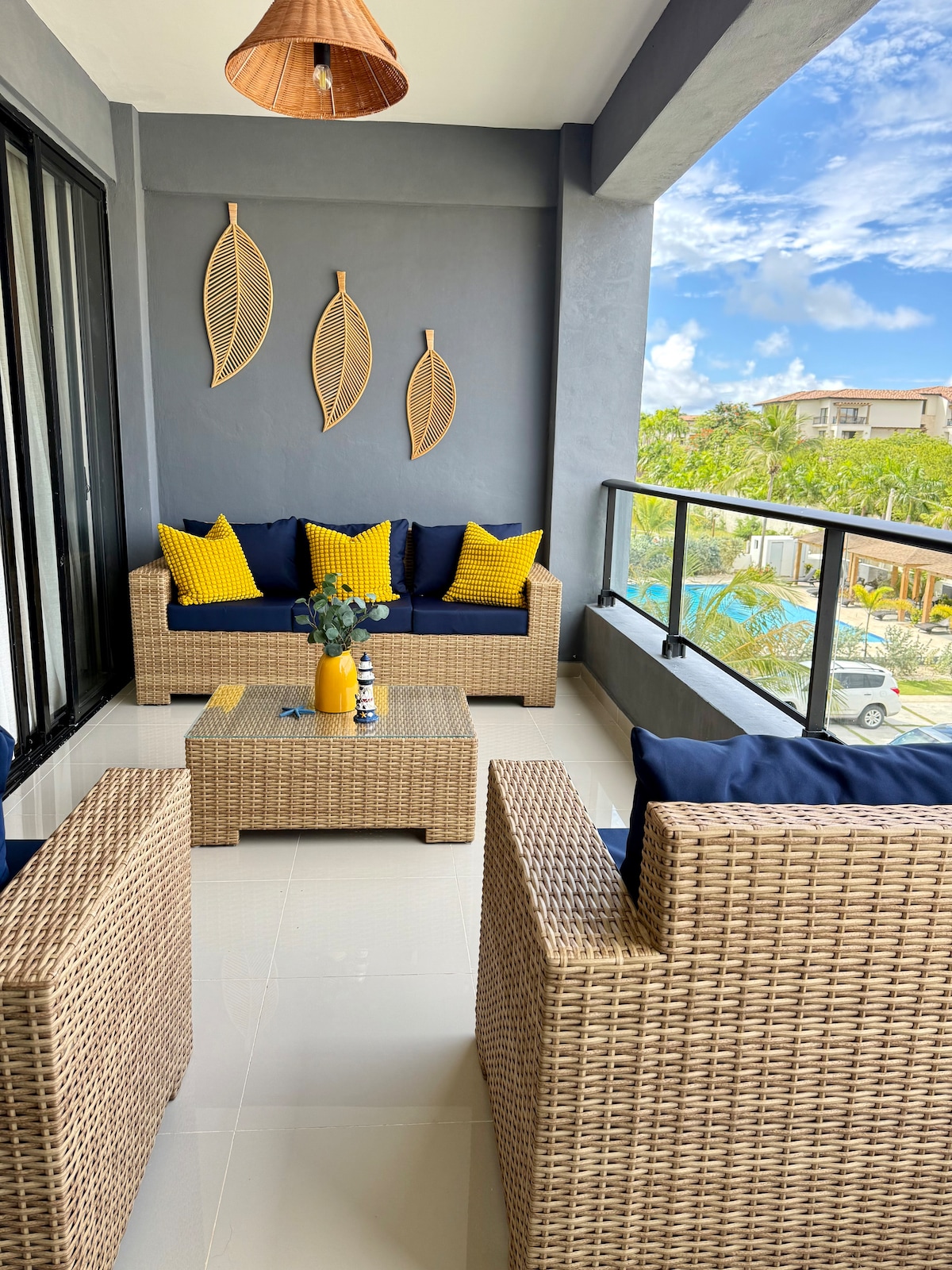 Apartamento totalmente amueblado cerca de la playa en bávaro, P.C. a solo 2 minutos caminando de la hermosa playa Bibijagua. Ideal para familias, amigos o parejas. Cuenta con: 2 habitaciones con TV y aire acondicionado, 2 baños completos y medio baño, Sala, desayunador y comedor. Cocina, balcón. Piscina en complejo. Ubicado en una zona segura y tranquila, con fácil acceso a restaurantes, supermercados, tours y vida nocturna.