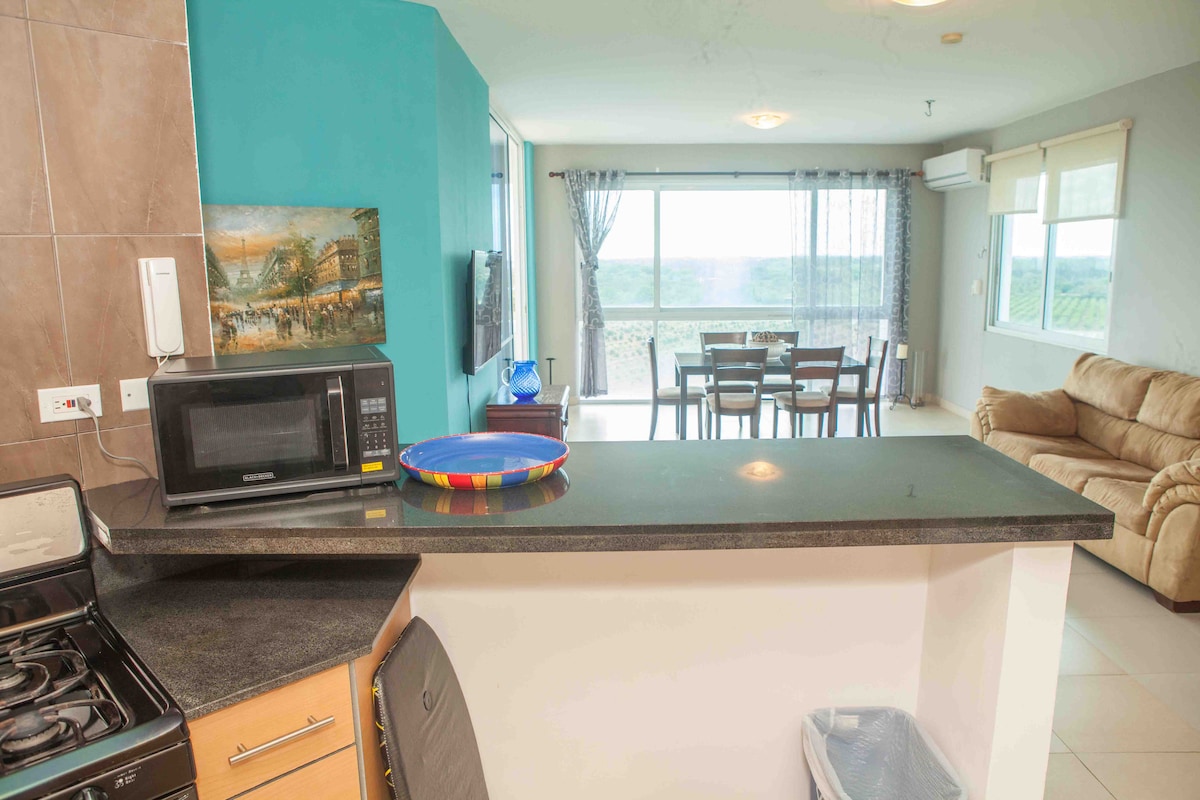 Enjoy a stylish experience at this centrally-located place in Playa Blanca Resort. Beautiful, studio, fully equipped apartment for maximum 4 adults. Located 120 kms west of Panama City. Ocean view. Membership to the largest salt water pool in Central America, slides, restaurants, tennis, basketball courts, children's playground. Easy access to the famed Playa Blanca Beach featuring an exclusive resident’s area. 2 king size beds, the kitchen is fully equipped. Individual WIFI and cable TV.