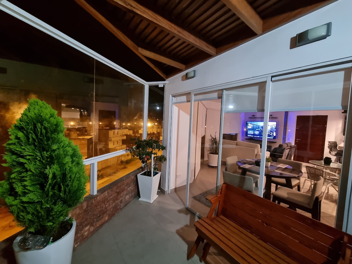 Hermoso departamento a 5 minutos caminando de la playa, ideal para familias o amigos, muy ventilado por el techo alto y varias ventanas. El primer nivel cuenta con 2 cuartos, cocina completamente equipada, sala con tv smart, excelente internet wifi, amplia terraza con parrilla y lavandería, mesa, bancas y 2 baños completos, El cuarto principal cuenta con cama 2 plazas, balcón y baño propio, el cuarto secundario: camarote de facil acceso. El segundo nivel: zona de trabajo y cama de 2 plazas.