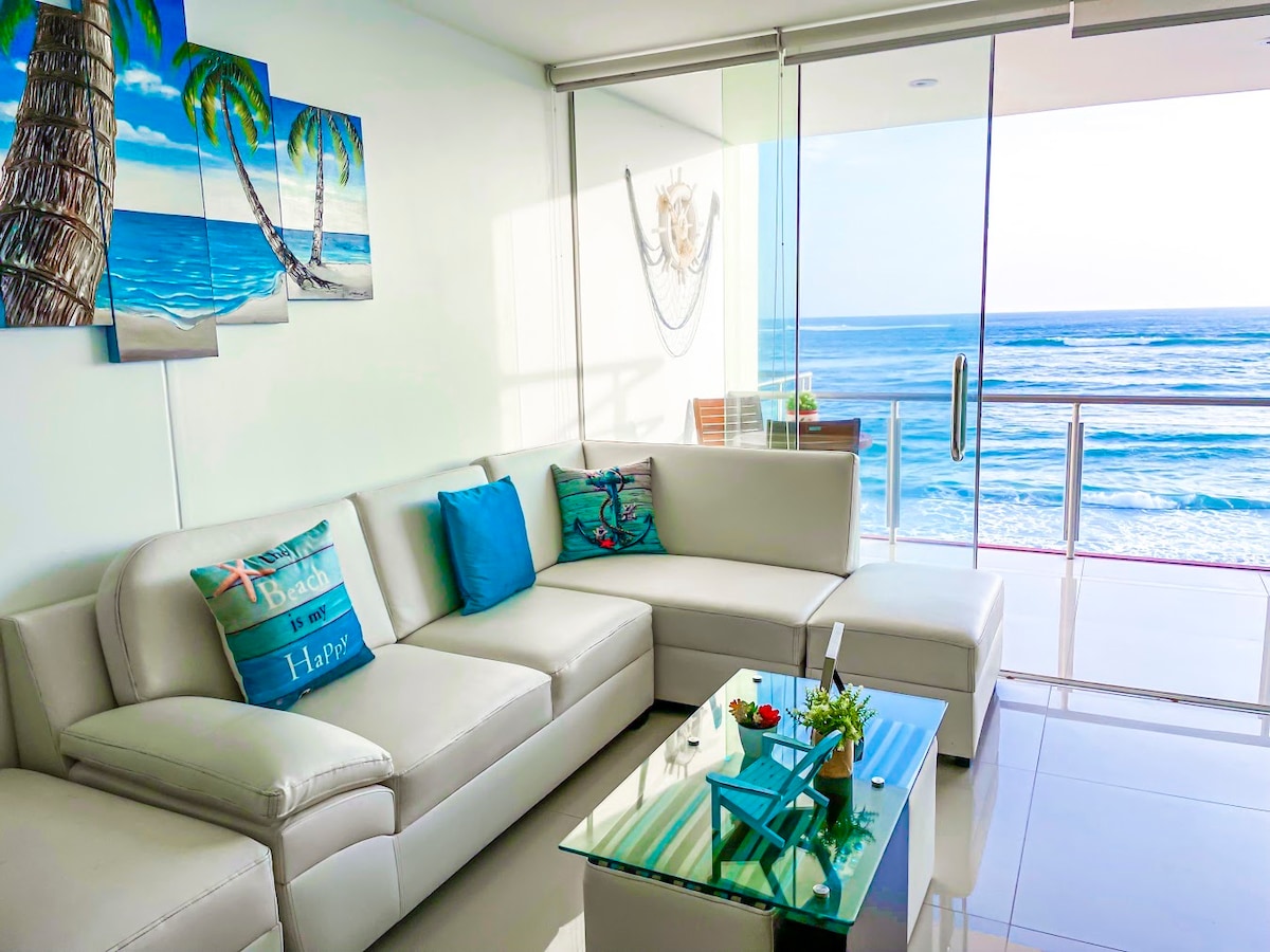Miniapartamento tipo loft , con vista al mar. Perfecto para pasar unos dias inolvidables en pareja. Cuenta con cama king, mueble cama, tv smart, wifi, cocina a gas, menaje, sala, mini comedor, baño con terma agua caliente, lavadora. Además, podrás aprovechar unas noches fabulosas escuchando el sonido del mar y disfrutando de una hermosa vista. La playa es pequeña, casi privada. La piscina es un area común de la casa, habilitada de 10 am a 6pm. NO BRINDO TOALLAS NI ARTICULOS DE ASEO PERSONAL.