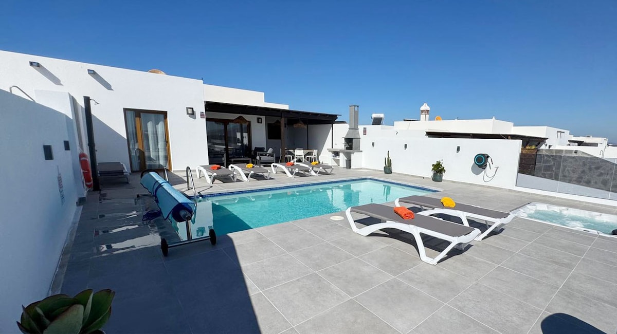 Luxurious villa with total privacy in Playa Blanca. Surrounded by high stone walls, protected from the wind and prying eyes. Views of the red volcano. Nice garden. The ocean is close (1 km). Heated salted pool (28 ° C) facing south. Large jacuzzi (36° C). Outdoor shower. Covered terrace for your meals, garden furniture and deckchairs. Entrance, large living room, dining room, fitted kitchen, 1 bedroom en suite, 1 bedroom with 2 beds and 1 bathroom. Private parking. 50 Mbps Wi-Fi, smart Tv