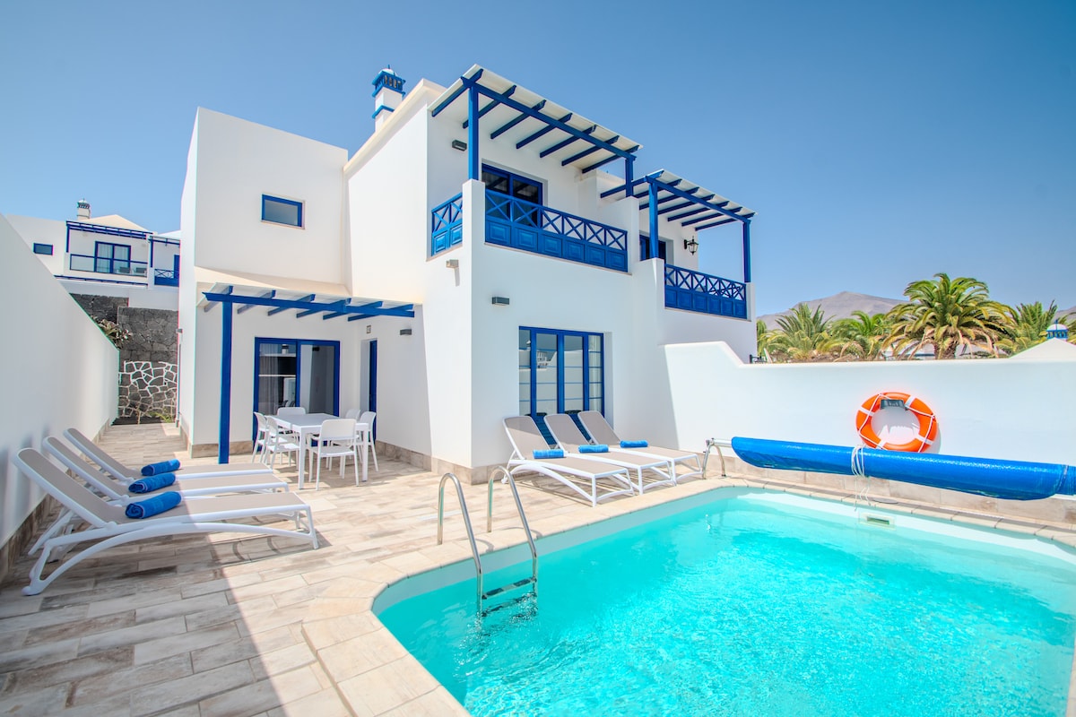 Discover your dream family getaway just 10 minutes from Marina Rubicón with its restaurants, bars and shops!This charming villa features two airy double bedrooms, a separate office space, and an extra bed for a fifth guest.Enjoy modern conveniences like fiber optics and international channels.Relax by the pool on the sunny southwest-facing terrace with BBQ. AC units available in the upper double bedrooms. With on-site parking and a safe, your holiday is both convenient and secure.