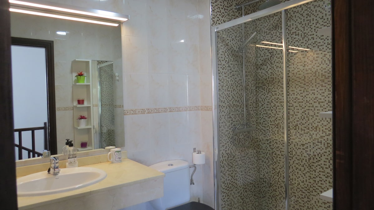 Casa Emma is an elegant and bright retreat, perfect for a relaxing getaway in Lanzarote. The house combines comfort and style over two floors, with a master suite featuring an en-suite bathroom and balcony overlooking the pool, plus a terrace with sea and mountain views ideal for sunsets. On the ground floor there is a fully equipped kitchen, a bedroom, a bathroom, a cozy living room with satellite TV, fiber Wi-Fi, and a private terrace with dining area, sunbeds and pool access.