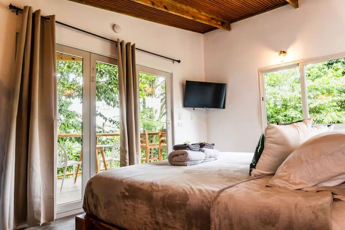 This modern style tiny home is located a beautiful jungle settings. Enjoy monkeys and birds from the comfort of your luxurious king size bed, couch, or twin beds in our vaulted loft viewing and sleeping area. Escape the heat and bugs with our AC cooled indoor area. A screened kitchen with appliances to prepare almost any meal. And a great bathroom with private outdoor shower to truly enjoy nature. We have games, books, and a smart tv to keep you busy on those rainy days. Enjoy!