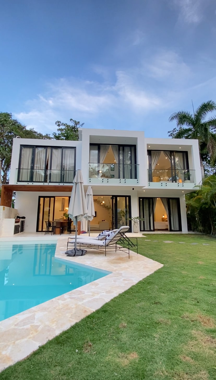 This is Villa Coral Blue of playa Bonita beach Las Terrenas. All you need for a group of 4 in Playa Bonita Las Terrenas. This small villa consist of a two story beautiful home with 2 bedrooms, 2.5 baths, full kitchen, bbq, pool, 2 parking inside, exterior bar, terrace, and the amazing Playa Bonita Beach just a few steps away. You will love this place and its design, no place like this in Las Terrenas. It's located in between a natural environment full of palms, coconut trees and native birds