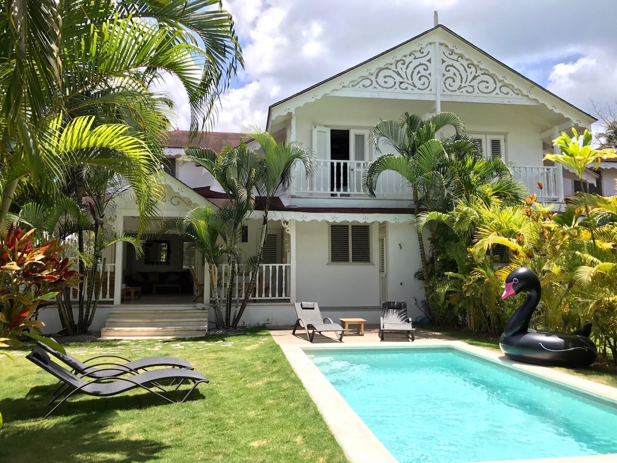 This Villa is in a peaceful residence that can accommodate up to 8 guests. Short walk to the beach (200m), town (300m) where you find shops, restaurants & supermarkets. The villa is newly built, with modern kitchen and bathrooms, with tropical gardens and a private pool. Fiber high-speed internet connection. In the morning you can buy your fish fresh on the beach (5 min. walk) and put it at night on the BBQ. Also, typical Dominican chef for additional fee &several excursions possible.