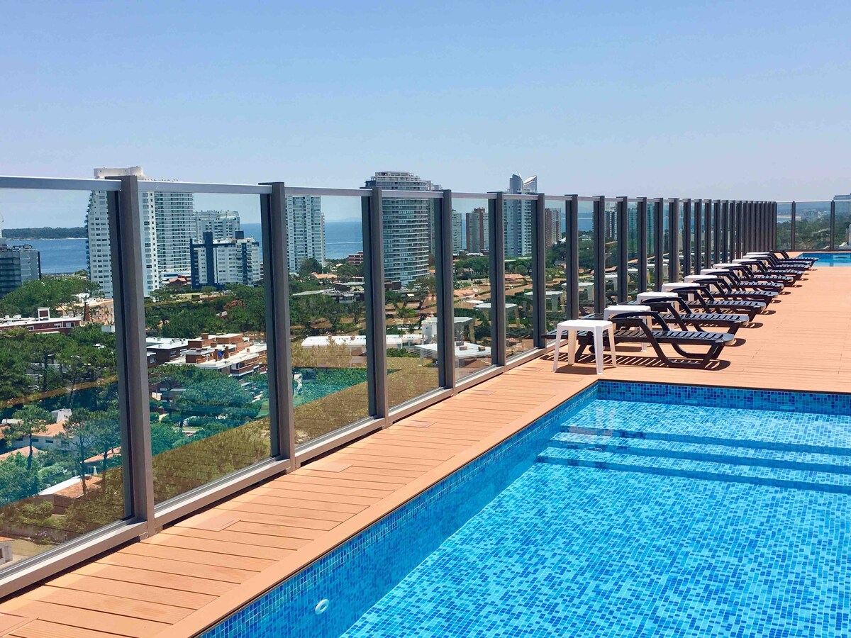 Precioso apartamento con vistas al mar a 120 metros de la playa, 1 dormitorio, living, baño, cocina y balcon, totalmente equipado y super comodo. El edificio cuenta con piscina climatizada interior con un jacuzzi , gimnasio, recepcion, dos piscinas exteriores y parrillero , un parrillero en la terraza con vista a la playa Mansa y la Brava y tambien parking. En una zona llena de restaurantes, mercados y mas. 😊