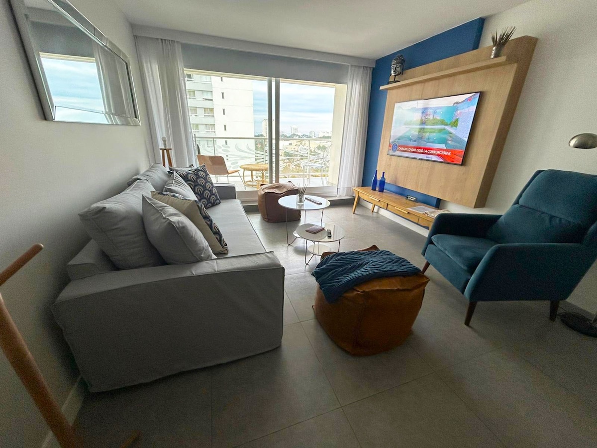 Depto en el piso 8 Torre Yoo. Un dormitorio con cama Queen sala de estar sofá cama; cortinas black out aire acondicionado calefacción living amplio y cocina completa, balcón terraza wifi gratis; tv 40’; estacionamiento cubierto incluido; piscina exterior y servicio de playa desde 01.12.25; instalaciones de Spa y gimnasio, Bar/ Servicio de playa durante el verano recepción las 24 hs. Cámaras de seguridad en el garage en la recepción en áreas en común por motivos de seguridad para el huésped.