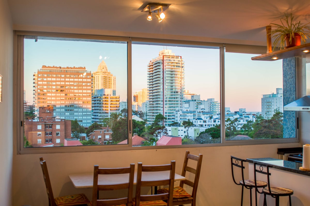 Punta del Este , apartamento a estrenar,muchísima luz natural en todos los ambientes. Edificio muy bien ubicado, con excelentes servicios; piscina climatizada, piscina abierta, gimnasio, barbacoa, cancha de futbol de césped sintético, microcine, sala de niños, adolescentes y adultos, garage cerrado propio, recepción 24 horas, lavadero, etc. wifi. plancha,secador de pelo. Totalmente equipado para 4 personas, ropa de cama y toallas, aire ,2 smart tv 40"
