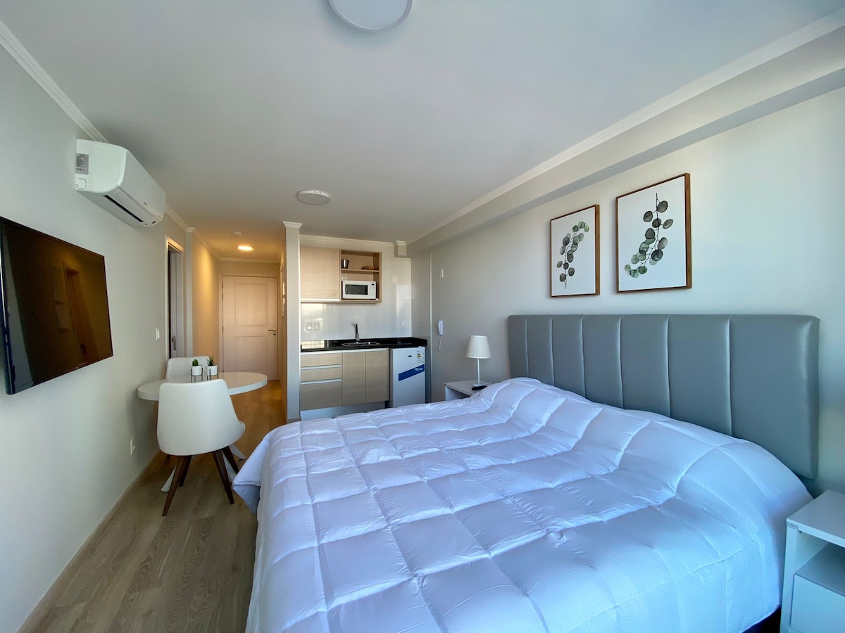 Relajate en este tranquilo alojamiento con los servicios de un hotel 5 estrellas. Departamento nuevo totalmente equipado para 4 personas con 1 cama queen y 1 sofá cama. El edificio cuenta con: piscina climatizada durante todo el año, gimnasio, micro cine, sala de adultos, sala de adolescentes, sala de niños, quinchos, cancha de fútbol 5, recepción 24 hs, excelente ubicación.