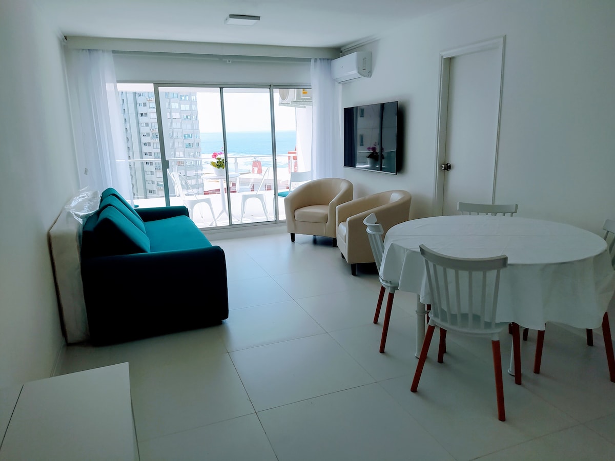 Inmejorable ubicación, frente al mar, apto tipo casa con 2 amplias terrazas, 2 dormitorios, 2 baños, living, cocina. Servicio de mucama incluido, WIFI, TV cable, parrillero, piscina, garaje y lavarropas, ropa de cama y toallas.