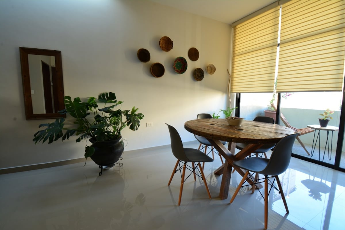 Cozy apartment on 2nd level, with great natural lighting, decoration and 2 balconies with view front and back of building. 2 fully equipped bedroom (one queen bed + 2 ind beds) 2 full bathrooms No elevator. Pets allowed -------------- Cómodo departamento en 2do nivel (planta superior) con mucha luz natural, decoración acogedor y balcones frente y detrás del edificio. 2 baños completos 2 recámaras (1 queen + 2 ind) No hay elevador. Se aceptan mascotas