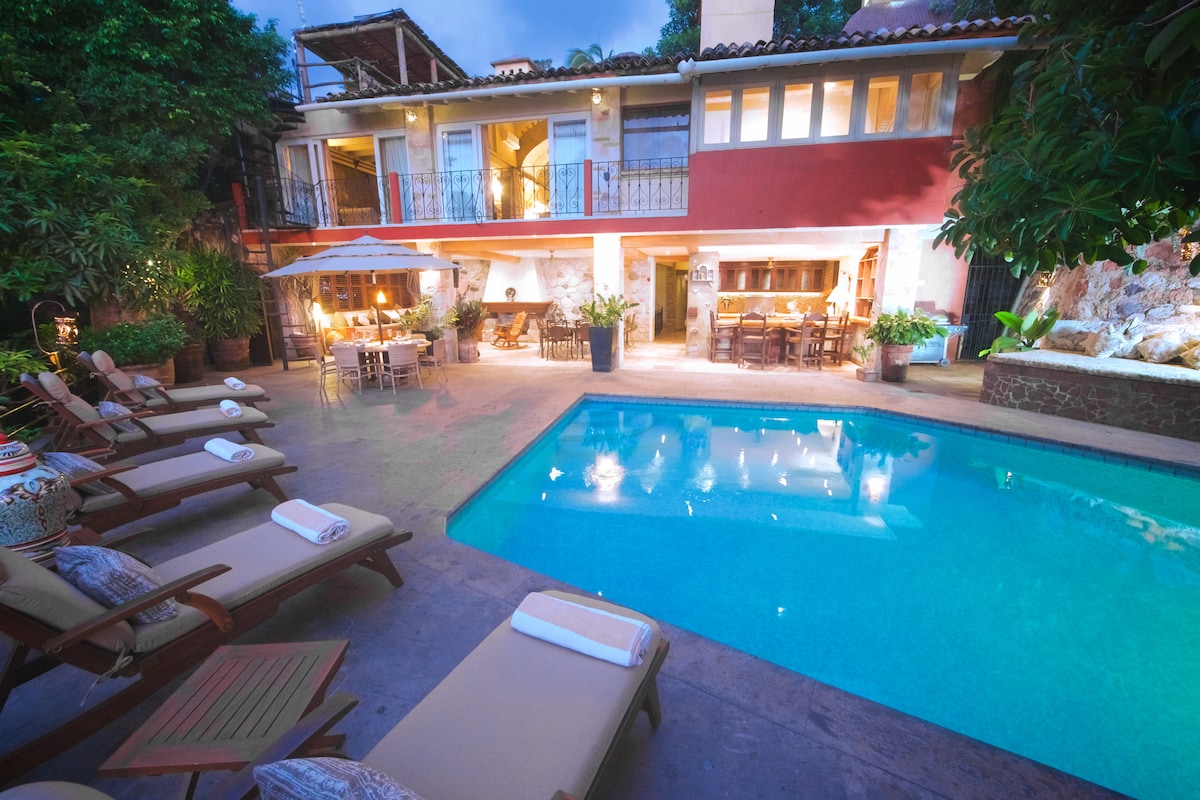 * 5-star guest reviews * 5 Bedrooms 4, en-suite bathrooms * 6 days a week housekeeping w/ cooking service up to 2 meals per day (food and drink extra cost) * 15 min. walk to the beach * 3 blocks to Basilio Badillo * Onsite concierge * Laundry services * 270-degree views of Bay, Puerto Vallarta and Sierra Madre Mountains * Landscaping/ private lot, parking with in-city living * Roku and , 55" television w/ wifi for streaming * Wet bar & ice maker * Private heated pool & barbecue