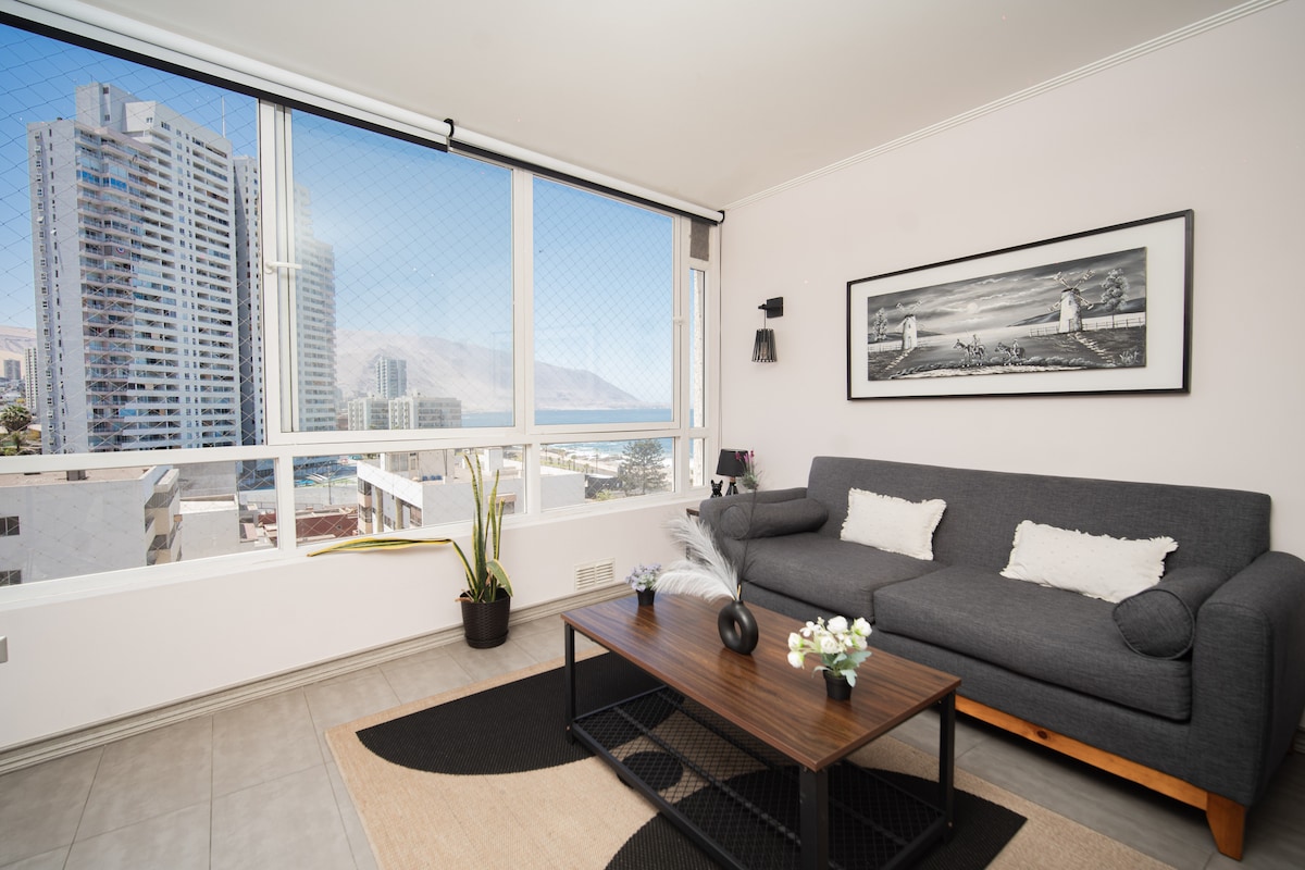 Bienvenidos a tu nuevo hogar temporal. Este encantador departamento de un ambiente y un dormitorio ha sido diseñado pensando en la comodidad y calidez que necesitas durante tu estadía. Perfecto tanto para familias pequeñas, parejas asi como para personas que viajan solas, el espacio combina funcionalidad con un toque hogareño, con una de las mejores vistas de la Costanera de Iquique. Te esperamos!!!