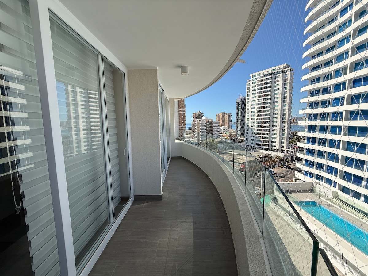 Departamento en la mejor ubicación de la ciudad y con una vista privilegiada hacia el océano pacífico, en primera línea frente al mar. Amoblado y decorado con estilo moderno y elegante, completamente equipado, equipos electrónicos, electrodomésticos, terraza de 20 m2, dos baños (uno en suite).