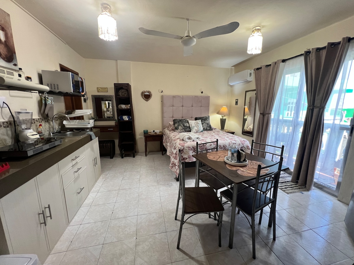 Sol Dorado 9 is just a 5-minute walk from the Ultramar ferry terminal. This simple second-floor studio includes: • A queen size bed, A/C, Wi-Fi, and Roku TV (only access to Netflix, YouTube, etc.) • A private bathroom with hot water (20L capacity) • A kitchenette with basic utensils and a jug of drinking water • A small safe box for your valuables The property is owned by my mom, Pia. Marcelina, our housekeeper, is also around and happy to help if you need anything during your stay.