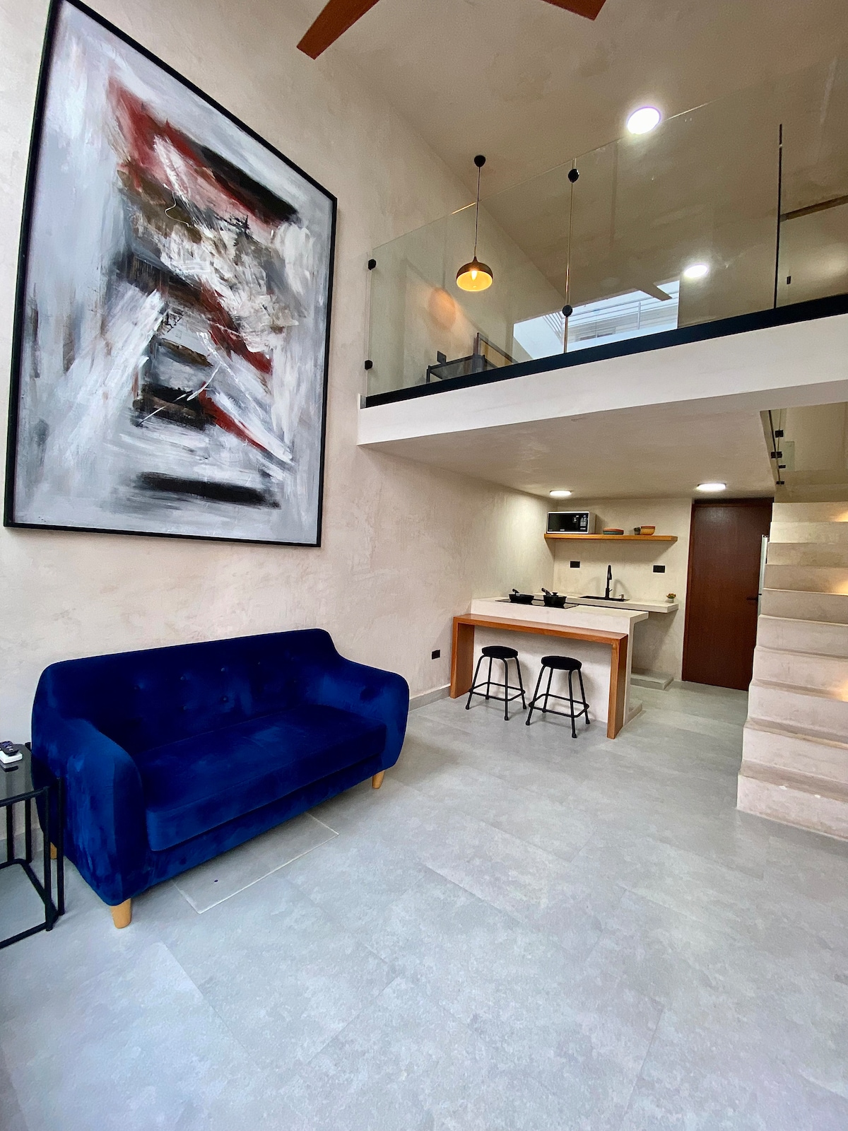 Este lugar tiene una ubicación estratégica, se encuentra en la zona de las mejores playas de Isla Mujeres y la zona comercial. Es un espacio cómodo, limpio y con todo lo necesario para relajarte y disfrutar de tu estancia. El espacio cuenta con cama queen size, una cocineta con lo necesario para preparar alimentos, amplio baño, closet, desayunador y una terraza techada para poder disfrutar las estampas de la vida cotidiana del lugar.