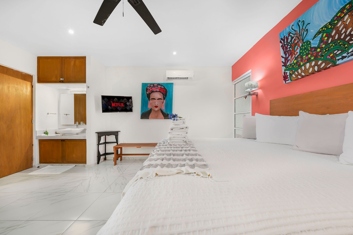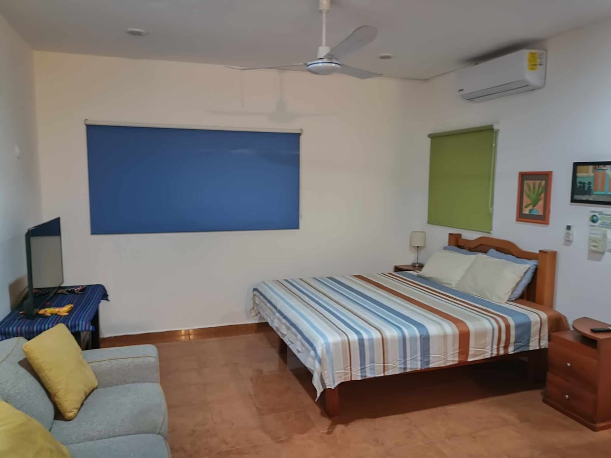 Sundreamers is located just one block from Northbeach, in less than 2 minutes you have your toes in the white sand, swim in the turquoise water or watch the amazing sunrise or sunset. Everything you need to enjoy your stay is right here in your studio apartment, colorful decorated with Mexican artcraft comfortable oversize beds, balcony, AC, WIFI, safe, private bathroom, closet, comedor, kitchenette with fridge, hotplate, toaster and coffeemaker to enjoy your stay and relax in your apartment.