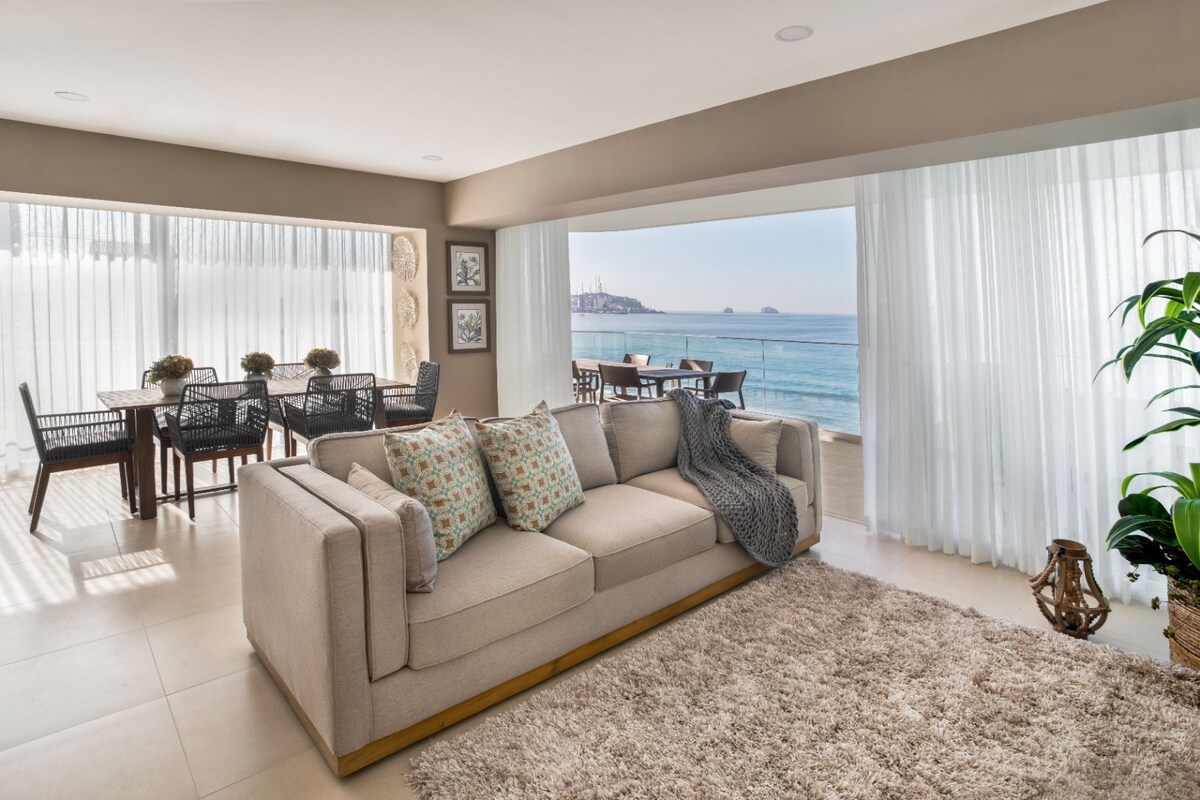 Preparate para la mejor vista en Mazatlán, las fotos no le hacen justicia. Nuestro lujoso departamento de dos recámaras es enmarcado en todo momento por la más espectacular vista del pacífico. En el podrás encontrar dos recámaras con baño completo, sala, comedor, cocina y terraza. El exterior es inmejorable, tendrás acceso a la playa, alberca, spa, ludoteca, sala de lectura, cine y bar. Estamos ubicados en la zona dorada, rodeados de playas, restaurantes y la mejor vida nocturna.