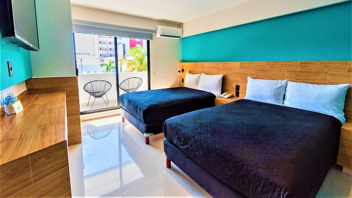 Habitacion para 4 personas con alberca consta de dos camas matrimoniales, contamos con alberca y pantalla gigante en Area de alberca, a dos calles de playa y 7 minutos de del malecón, son varios colores por eso se adjuntan diferentes imágenes