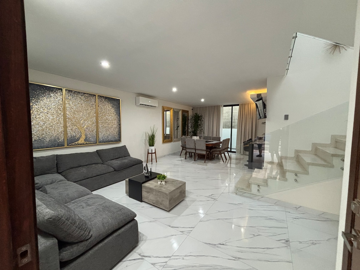La playa esta a cinco minutos caminando, la zona es muy tranquila y privada con vigilancia las 24 hrs. La casa esta supercomoda con tres recamaras y cada una con baño completo y smartv, pueden hospedarse hasta 8 personas sin costo adicional, aunque no cuento con camas adicionales, Cuenta con wifi, aire acondicionado en toda la casa, el jardin es precioso, y el area comun esta padrisima, cuenta con area de juegos, alberca, cancha de futbol rapido y cancha de basketbol