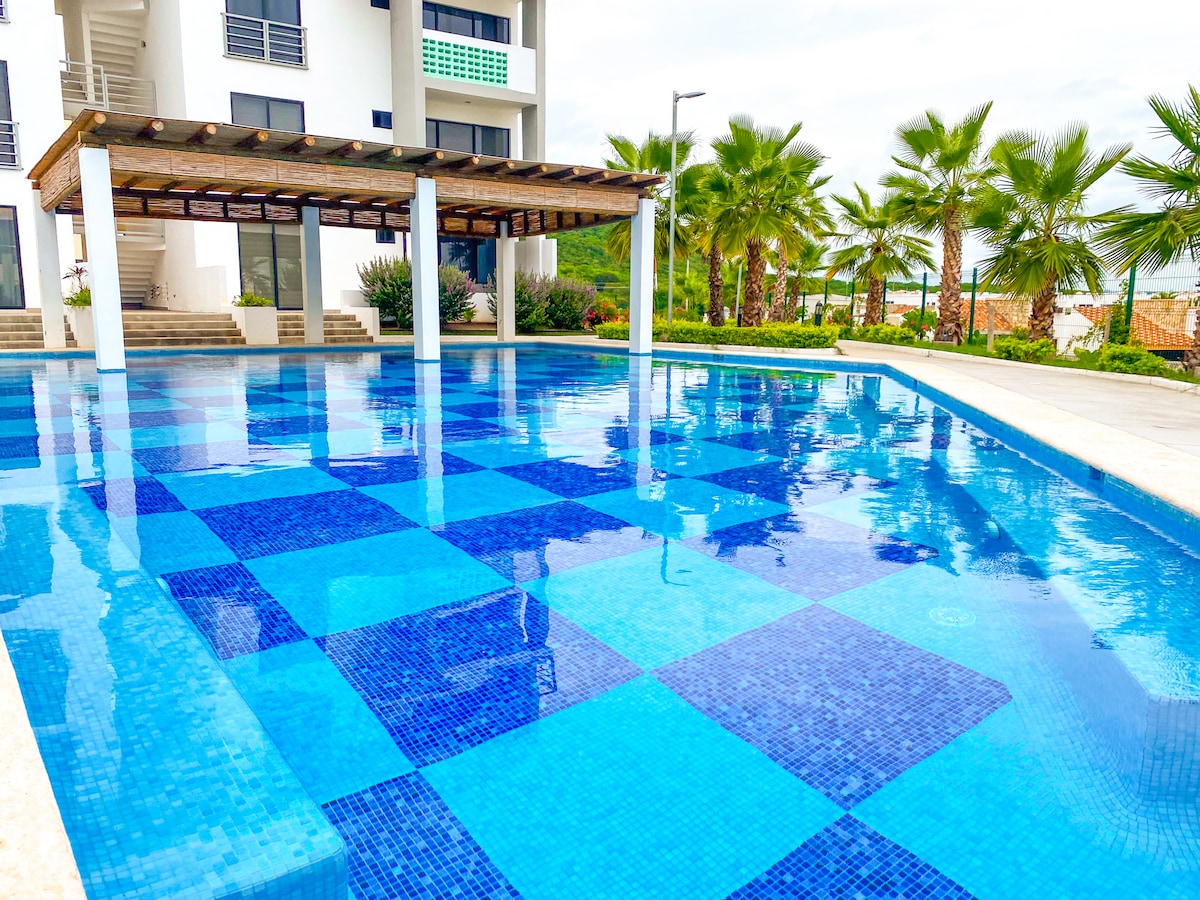 This modern and new apartment is the perfect place for a family stay. It is located in a private subdivision with controlled access, recreational areas and a few minutes from the beach. It has a nearby supermarket, pharmacy and a store at the entrance. The department has: ⦿ Two bedrooms and two full bathrooms ⦿ Integral kitchen with utensils, coffee maker and microwave oven ⦿ Washer-dryer ⦿ TV with Internet and Netflix ⦿ Parking 2 cars ⦿ Common area with pool, jacuzzi, grills, children's game