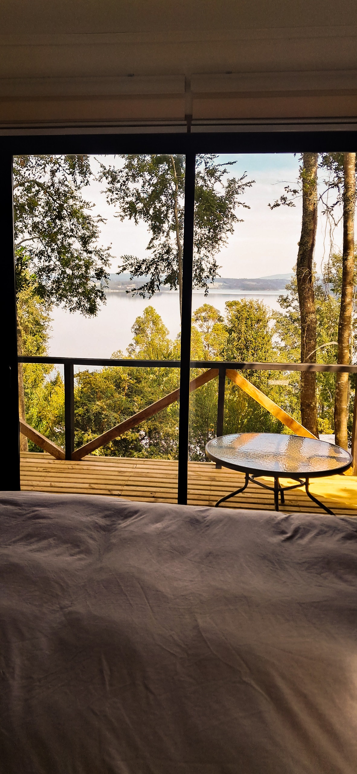 Duplex for 2. 7 mts above ground. 2 acre private park. Decks with panoramic views to infinity and a hanging bridge to let your dreams fly. Thermal insulation, double glass windows, floor heating and slow combustion fireplace. Queen size bed. Desk, Wi-Fi, full kitchen with fridge, induction top and all the necessary utensils to enjoy the stay. Full bath with a shower with amazing view, towels, hair dryer, bidet!, fire pit, bbq and parking. 6 kms from Pucón on paved road. Ran by its owners.