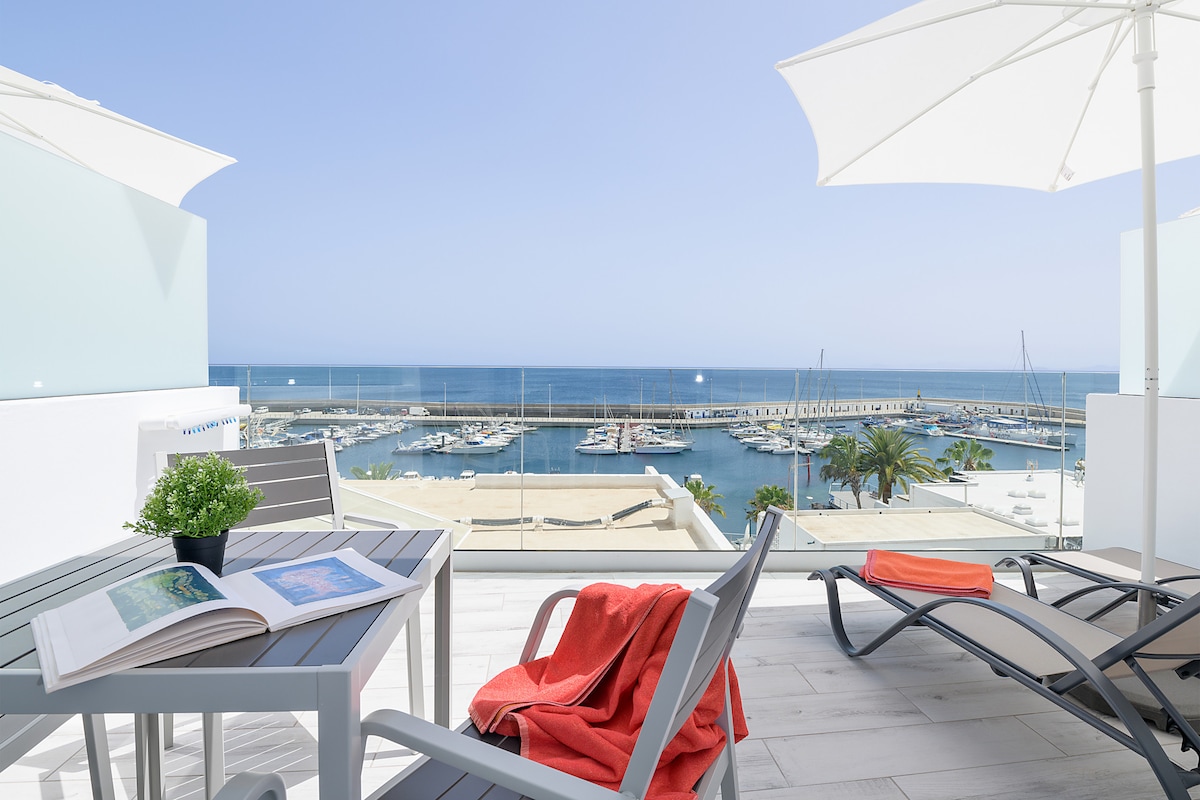 Spectacular designed penthouse with a huge terrace with panoramic sea views. Located in the old town of Puerto del Carmen, in La Tiñosa, two steps from the fishing port, one of the most sought-after and esteemed places, for its traditional marine buildings and for its gastronomic offer based on fresh fish. A unique place to enjoy a vacation of dream. Close to all kinds of activities, beaches, supermarkets, shops, and restaurants.