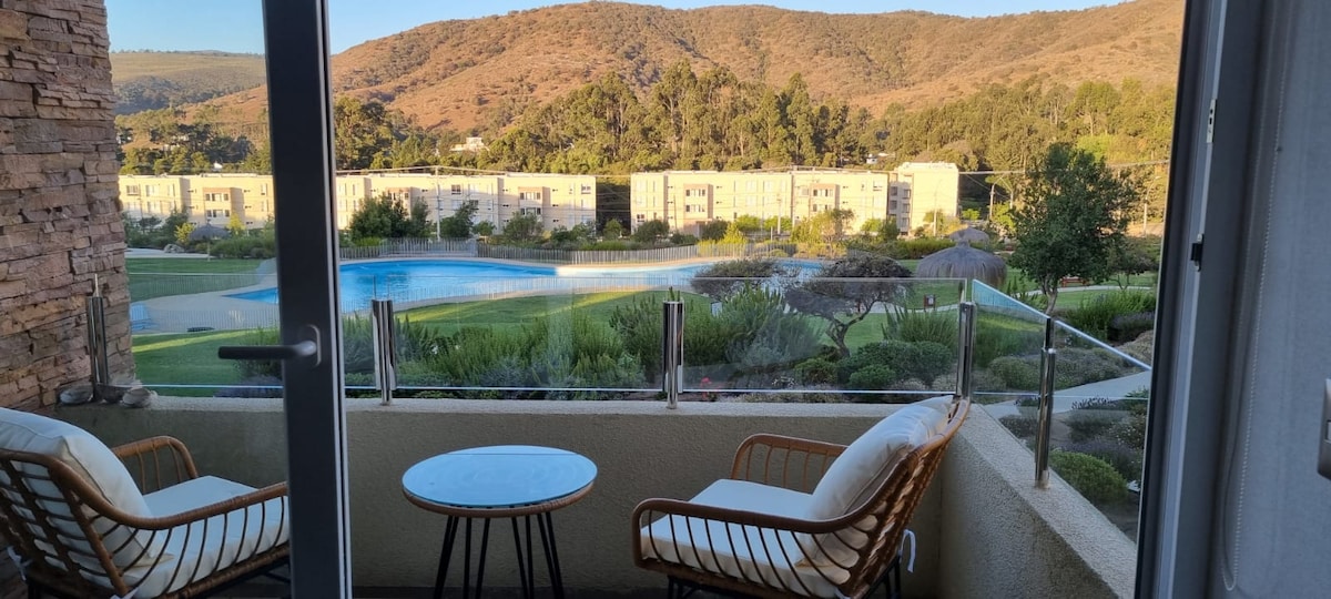 New and central condo apartment 1 block from the beach and plaza, where the best bars, restaurants, cafes and stores in Papudo are located. Ideal for families, couples and friends who want to stay in a comfortable, safe place, with 2 swimming pools, barbecue areas, a relaxation room with various amenities. All spaces have access for people with reduced mobility. Located in a strategic and privileged location steps from the beach, yacht club and fishermen's cove.