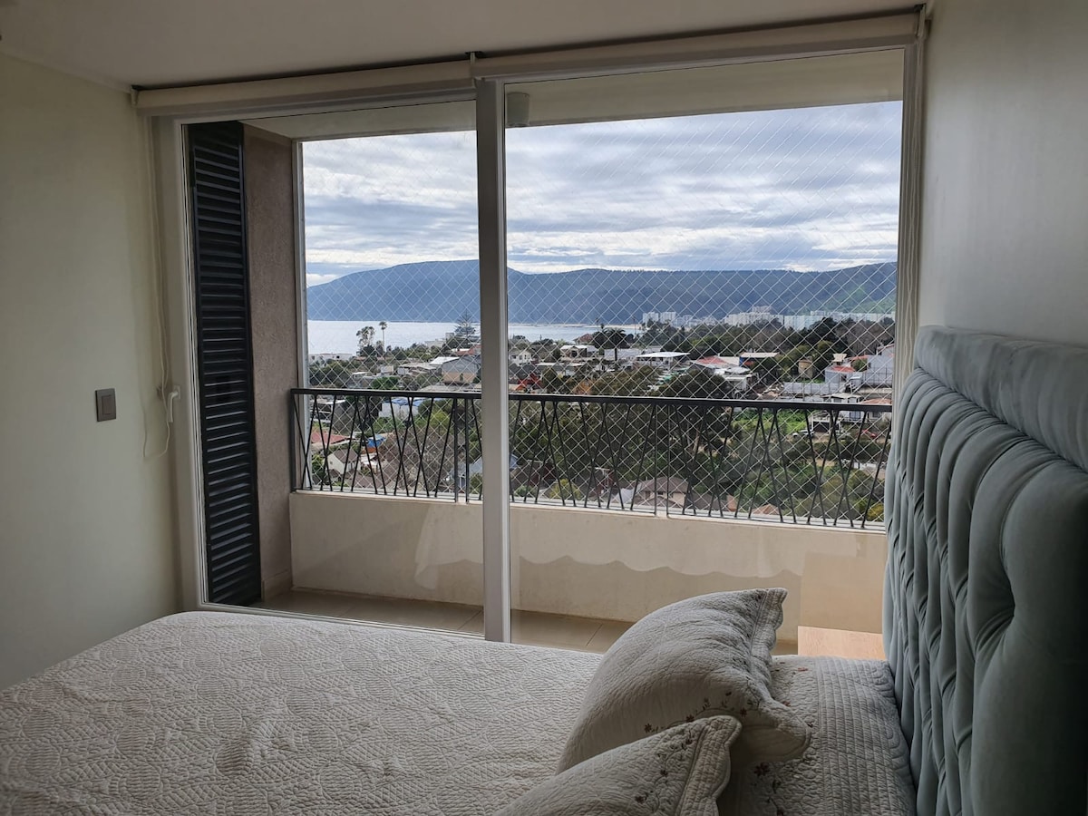Lindo departamento con terraza y una hermosa vista a la bahía, a pasos de la playa chica, plaza, restaurantes y todo el comercio de Papudo. El departamento está en el piso 7, cuenta con estacionamiento, dos habitaciones y dos baños. Una habitación matrimonial con baño en suite y cama de 2 plazas, la otra cuenta con un camarote y una cama nido para aprovechar el espacio (y un futón en el living) Cuenta con wi-fi, televisores smart , Lavadora-secadora, y todo lo necesario para una gran estadía.