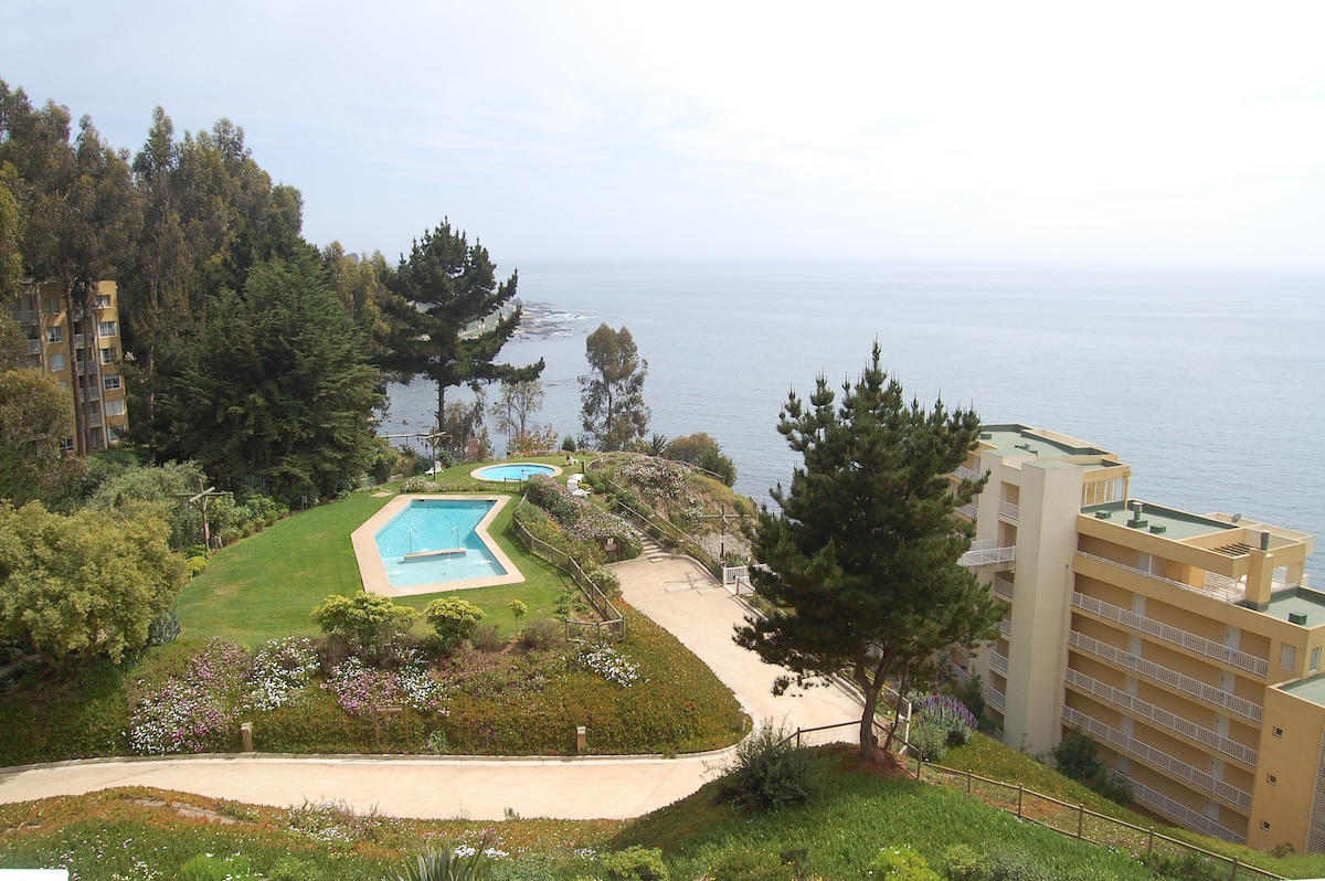 Hermoso departamento recién remodelado para ofrecer una experiencia inolvidable, en primera línea frente al mar cautiva todos tus sentidos. Preparado para estadías placenteras, cocina, coffee corner, escritorio-comedor, terraza, parrilla eléctrica, TV y Wifi. Caminado por bosques bajas a hermosa playa privada o a las piscinas, sauna, jacuzzi, canchas deportivas del condominio. Horcón tiene para comprar todo lo que necesites o a almorzar en los restaurantes. También puedes recorrer la costa.