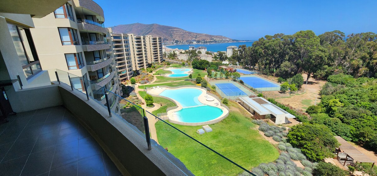 Condominio residencial, con una vista panorámica a la playa y acceso exclusivo al mar. Cuenta con juegos para niños con una ubicación segura a la vista de los padres. 3 piscinas exclusivas del condominio y una es temperada. Cancha baby fútbol y parrilla para asado en el mismo departamento. Incluye dos salas de juegos, gimnasio y sala de estudio con WIFI Se pueden realizar cabalgatas por la playa. Conserjería 24 horas Banda Ancha Móvil (wifi) independiente del departamento