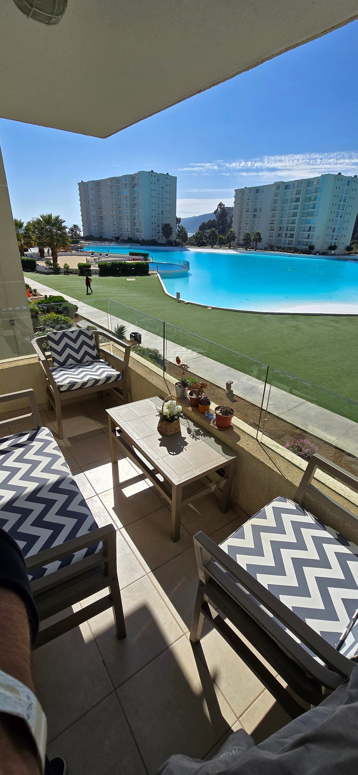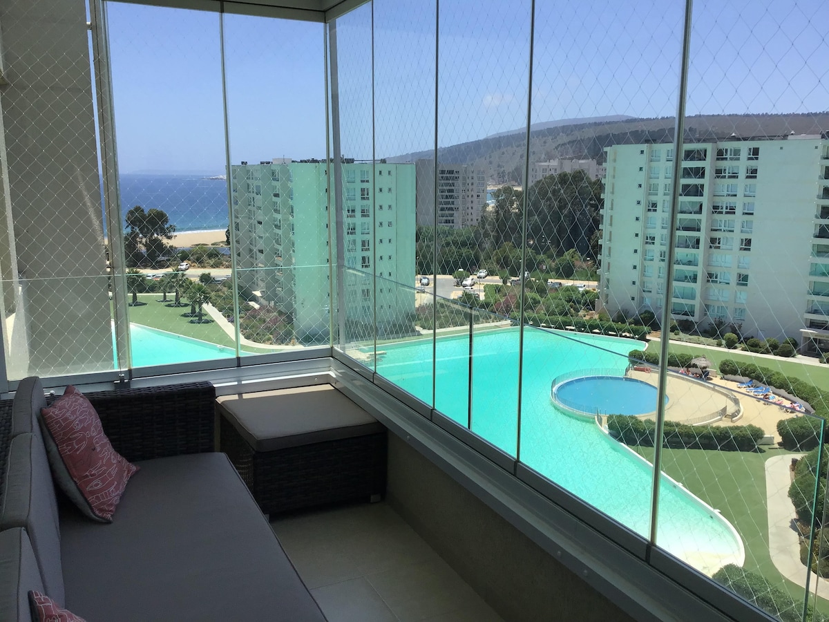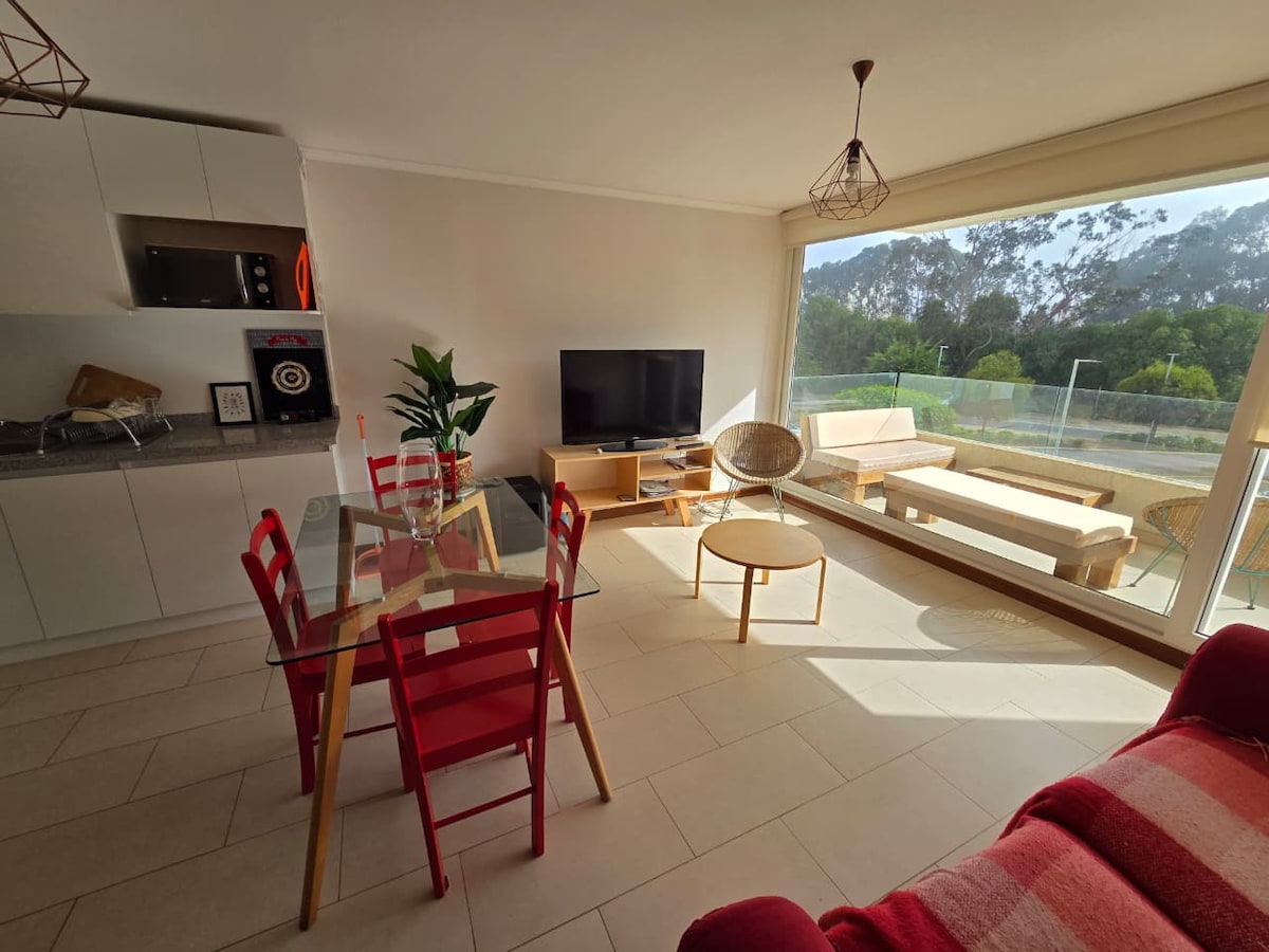 Depto, 7 personas, wifi, smart tv. Maravillosa vista al mar. Sin ráfagas. Roller blackout. Cocina y comedor equipados, parrilla. No incluimos sábanas ni toallas. Cama King pieza principal. 1 o 2 estacionamientos. Primera línea, salida directa a playa. Múltiples áreas comunes canchas fútbol y tenis, 3 piscinas y laguna navegable con kayak incluidos. En la playa hay quitasoles y cancha de Volleyball. Muy cerca playa los Lilenes, bosque de eucaliptos. Restaurantes y pubs a pasos del condominio.