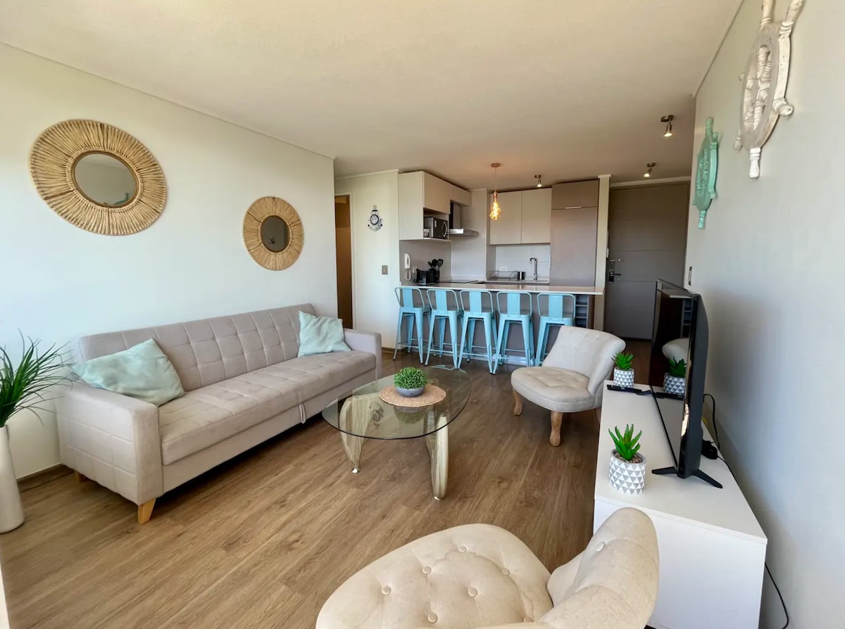 Enjoy tranquility and style in this elegant 2-bedroom, 2-bathroom apartment, featuring luxury furnishings and a spacious terrace with a built-in grill and unmatched ocean views. Just a 5-minute walk from the beach, it's perfect for a getaway. Located in an exclusive condominium with a modern design that preserves the charm of the Chilean coast. It offers a game room, landscaped green areas with walking paths, seating areas, a pool, and an outdoor fire pit.