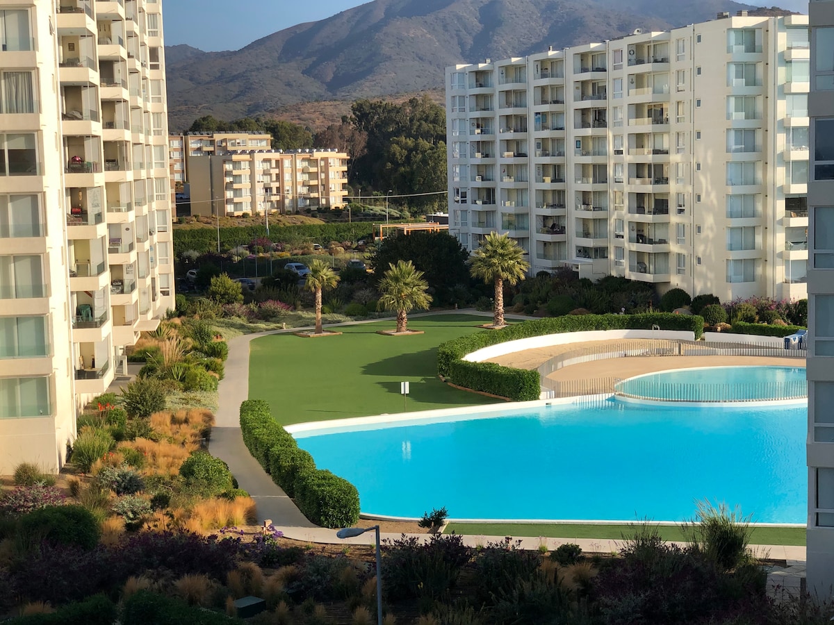 Acogedor departamento nuevo en Papudo con vista al Humedal y a pasos del Mar tiene laguna, piscinas e instalaciones para pasar unos días de relajo con familia o amigos practicando Kayak, Stand Up Paddle, Futbolito, Tenis, Volley Playa, Mountain Bike, Surf o Bodyboard. A minutos en la Plaza de Armas, hay Restaurantes, Pastelerias, Minimarkets y Farmacia que ofrecen excelentes servicios. También Feria Agricola y Caleta de Pescadores son alternativas. PAPUDO, Encanto de Pueblo y Belleza de Resort