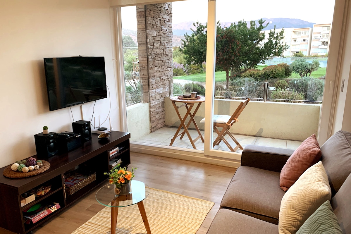 Hermoso departamento recién entregado en Papudo, fantástica vista a playa y laguna donde se realizan deportes náuticos, equipado 100%, linda decoración, cocina equipada completa, todo para 6 personas, televisores y parrilla a gas. Todo el equipamiento es nuevo. Ambos baños con ventana y secador de pelo. El condominio cuenta ademas con multicanchas, lavandería, sala de eventos, canchas de tenis y laguna navegable con uso de Kayak gratis para los usuarios. Tenemos 70 canales de Tv y wifi.