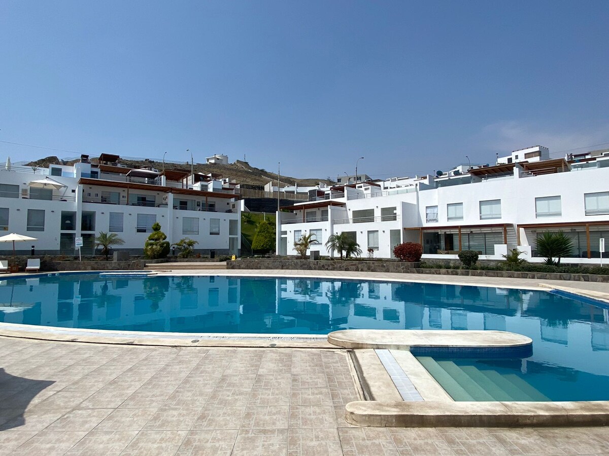 ✨ Disfruta de un refugio pensado para compartir momentos especiales con tu familia, amigos y mascota 🐾. Relájate en la piscina 💦, comparte en la parrilla 🍷, pasea entre amplias áreas verdes 🌳 y déjate cautivar por atardeceres mágicos 🌅. El condominio admite mascotas, aunque la playa cercana no permite su ingreso. Todo esto en un ambiente seguro y sereno 🌿, a solo 7 minutos en auto de la playa 🏖️ y del Boulevard de Asia 🌴.