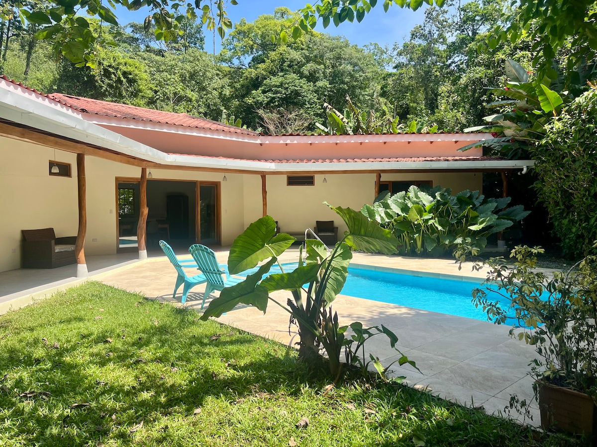 Forget your alarm clock. You will awaken to sounds of howler monkeys and tropical birds in this Caribbean style home. You can step directly from the dining area into the in the pool with waterfall- just 500 meters from the beach. Costa Rican hardwoods, wrap this nearly 2000 sq. ft, 2 BR/2.5 baths home. The downstairs living area is openair where you can be visited by hummingbirds. You will have a birds eye view from the 2nd floor wrap around balcony. Send us a message with your questions.