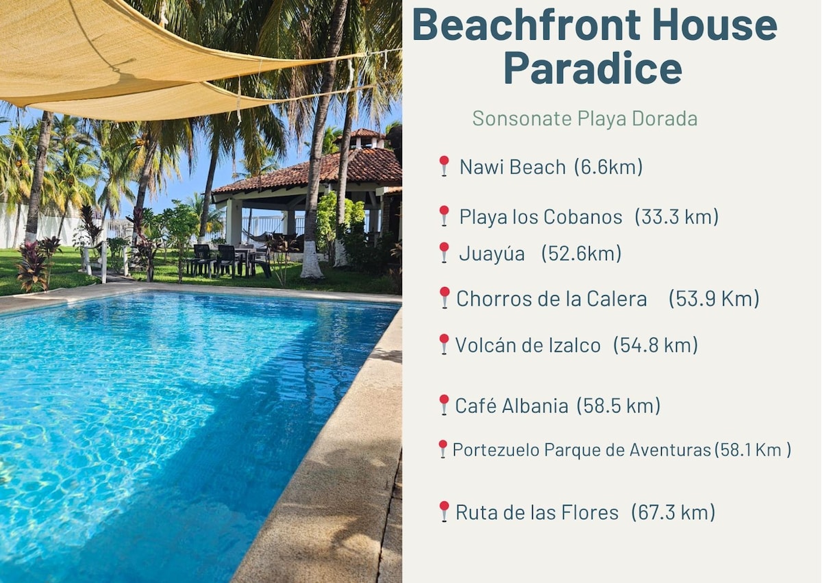 Front beach house, eco-friendly with 90ft long pool, 4 bedrooms 3 bedrooms with second floor private hammock, living roam and ocean view, queen size beds all with A/C. 1 standard full size bedroom all with private bathroom. fully equipped kitchen, Social palapa with aerial hammock up to 6 persons, 12 person dinning roam, living roam, barbecue, decks ocean front. TV living roam, social bathroom, starlink WiFi, 2h away from the airport. Parking up to 8 cars.