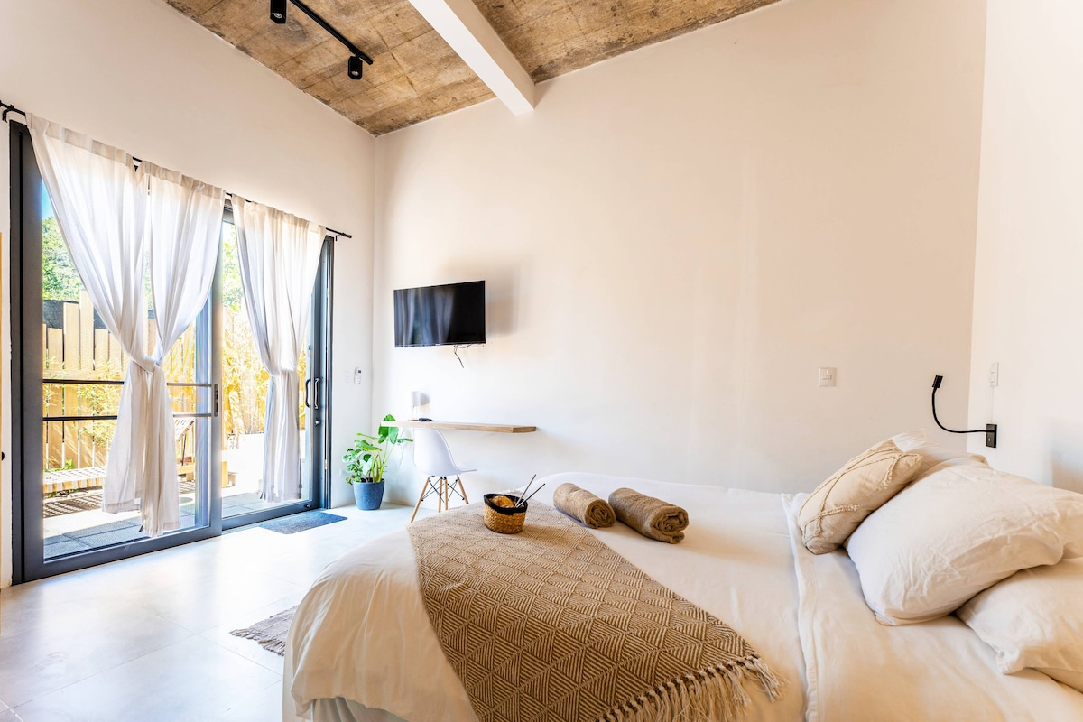 NAIA STUDIO is floating into the jungle of Santa Teresa, overlooking the green valley and pacific ocean. Only a short 3 minute drive directly to the most popular restaurants and beautiful beaches of Santa Teresa. Beginning your day rising up in in the plush bed, overlooking your private plunge pool facing out to the ocean as you listen to the sounds of the jungle. A perfect vacation home for couples or single traveling vacationers.