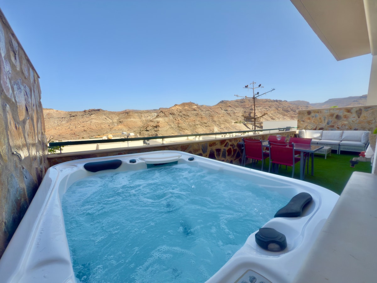 This unique place has a style all its own. Just remodeled entire floor has a private heated pool and panoramic views to ocean, golf course and mountains. It has 3 bedrooms, 2 bathrooms and spacious living room with a new fully equipped kitchen .Two big terraces for your enjoyment .Located in cute little village Tauro next to Anfi Golf, beaches Amadores and Tauro,2 minutes to Puerto Rico big shopping and night life.