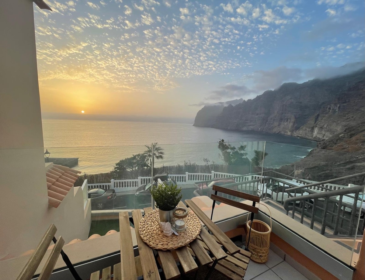 Spacious and quiet 3BR apartment in Los Gigantes with breathtaking views of the ocean, marina, cliffs, and islands. Each bedroom opens to a panoramic terrace. Enjoy sunsets, sea breeze, a shared heated pool, quality amenities, and newly renovated interiors. Just a 5-min walk to town – no restaurants nearby, only the sound of the waves.