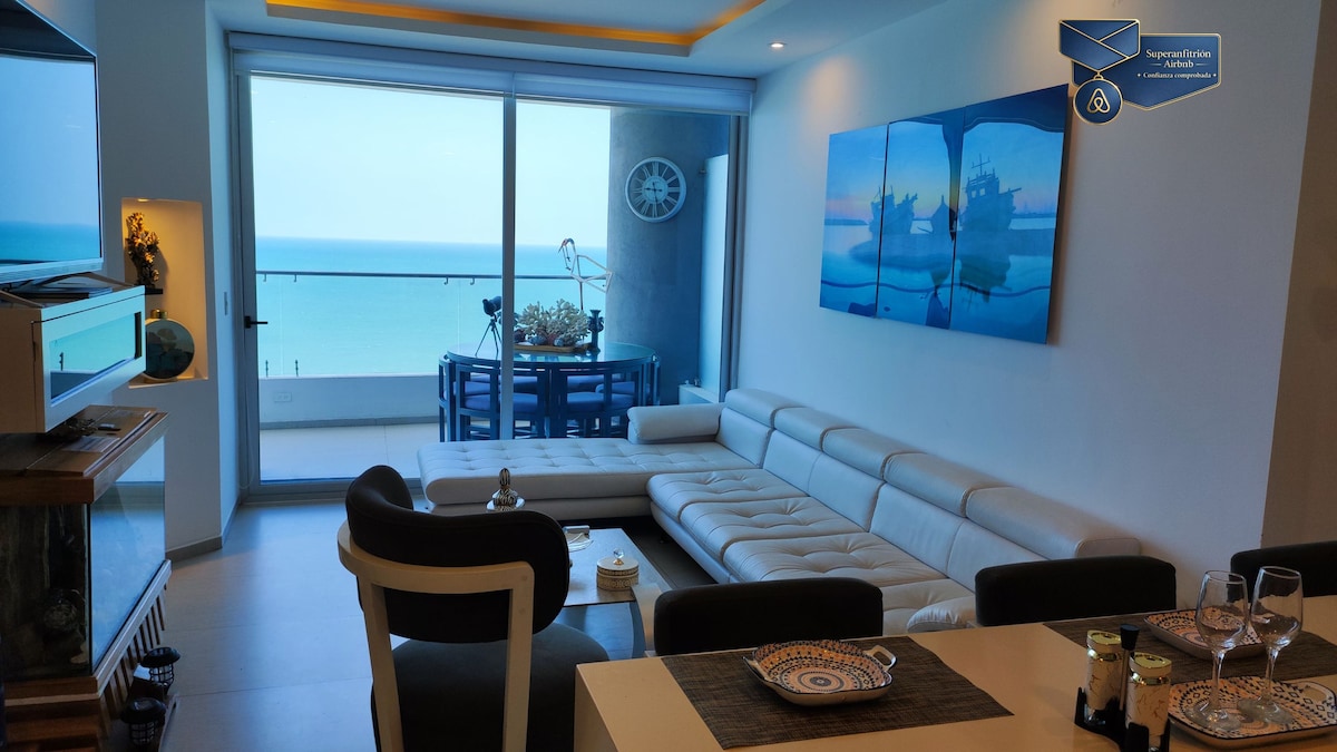 Ubicado en el mejor edificio de la costa del pacífico EL GRAND DIAMOND BEACH, alojamiento de lujo con un apartamento que cuenta con balcón y hermosas vistas al mar. Este lugar cuenta con dos habitaciones que pueden albergar a un total de seis personas, además de una cocina completamente equipada, televisión smart, conexión a internet y aire acondicionadoem todos los ambientes, encontrarás un jacuzzi y una mesa de comedor que te permitirán disfrutar de una vista inigualable mientras te relajas.