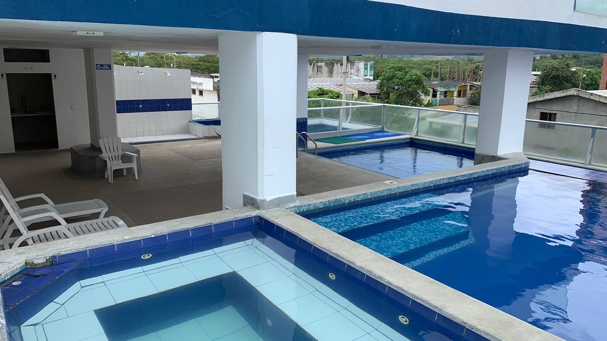 Disfruta días inolvidables frente al mar en un cómodo y amplio departamento de 4 habitaciones con vista espectacular al océano.En el quinto piso, la brisa marina te envuelve y crea el ambiente perfecto para relajarte. Escucha las olas desde la terraza, báñate en las 2 piscinas para adultos o en las mini piscinas poco profundas para niños pequeños. Rodeado de jardines cuidados, el conjunto Vía Marina es ideal para descansar en familia. Cuenta con ascensor y guardianía 24/7 para tu tranquilidad.