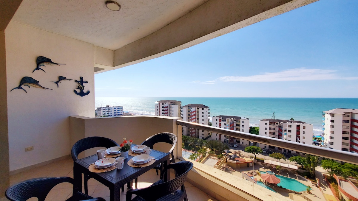 Situado en Tonsupa, ofrecemos un hospedaje de calidad, el departamento cuenta con balcón con vista al mar. Tiene 2 habitaciones, con capacidad para 6 personas, cocina totalmente equipada, televisión, cable, internet y aire acondicionado. En el balcón tiene jacuzzi y una mesa de comedor, para disfrutar con la mejor vista. Hay dos piscinas, una descubierta, con el área de juego para niños, y otra cubierta y temperada, tiene 4 hidromasajes, sauna, turco, gimnasio, canchas múltiples y minigolf.
