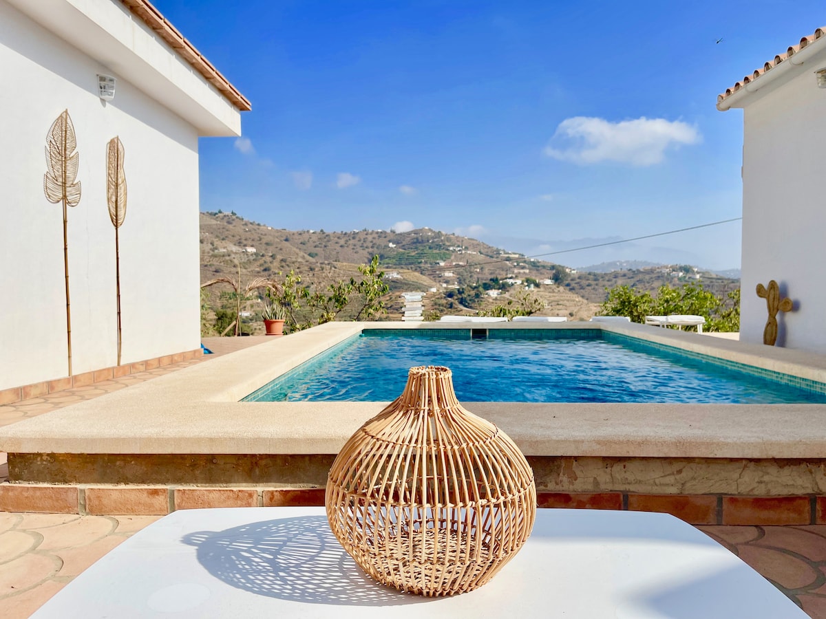 Gezellig familiehuis voor 2 gezinnen of 1 grote familie (8 personen + 2 babybedjes) met privé infinity pool (9x4m), verwarmd vanaf april t.e.m. oktober door middel van zonnepanelen. Prachtig uitzicht op de vallei van Vélez-Málaga en de Middellandse zee. Ideaal vakantiehuis voor wie houdt van een unieke locatie, zeezicht, natuur, prachtige zonsondergangen en sterrenhemels, en bovenal rust.