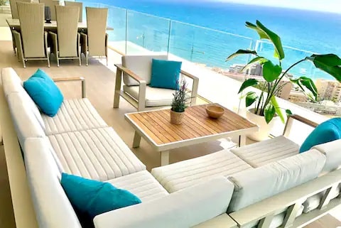 Penthouse Deluxe "Super large" with amazing panoramic views to the Mediterranean Sea and free private parking for our guests. It has an impressive terrace with BBQ and private Jacuzzi, where you can enjoy fantastic summer evenings with your family and friends.