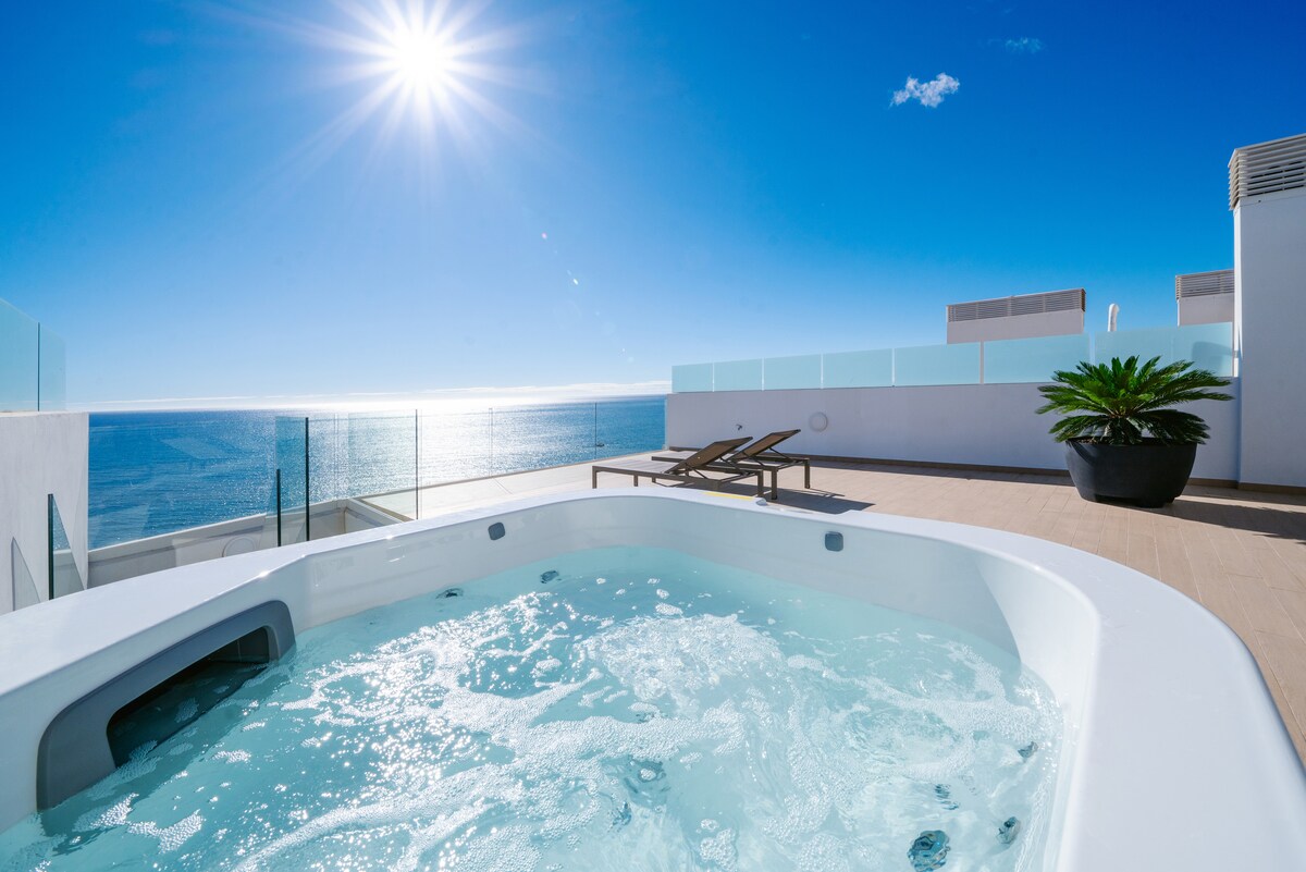 Brand New! A beautiful luxury penthouse located in the stunning village of Mijas Pueblo. * The Best Ocean & Mountain views that the Costa del Sol has to offer * Relax on your own private roof terrace including a hot tub, day bed & sunloungers. Both the roof top terrace and the dining terrace is a great space for entertaining, relaxing & enjoying the amazing sunset and views The penthouse has a luxury décor with open plan living, both bedrooms have sea views & comfortably sleeps 4 people